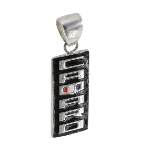 This Camaro vertical pendant comes with enamel (black, red, white and blue). The pendant measures 1-1/2” long and is made in sterling silver.