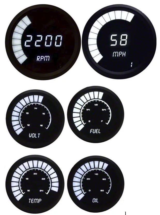 Sleek Style. Featuring a sleek digital gauge style, this multi-gauge set brings a modern touch to your dashboard. The gauges are illuminated superbly, ensuring clear visibility in any lighting condition. This illumination not only enhances functionality but also adds an aesthetic appeal to your vehicle's interior.