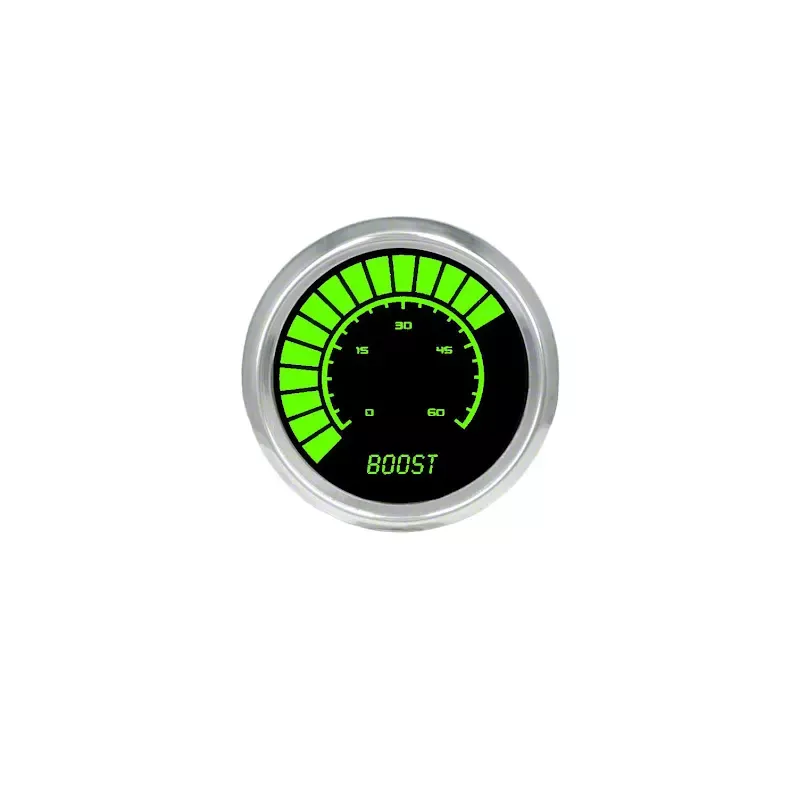 Accurate Boost Measurement. The LED Digital Boost Gauge with Chrome Bezel is designed to accurately measure boost pressure with unparalleled precision. Featuring a microprocessor-controlled system, it delivers 0-60 PSI accuracy in 1 PSI increments, making it an essential tool for high-performance tuning and monitoring. Its larger digits ensure visibility, enhancing both functionality and style.
