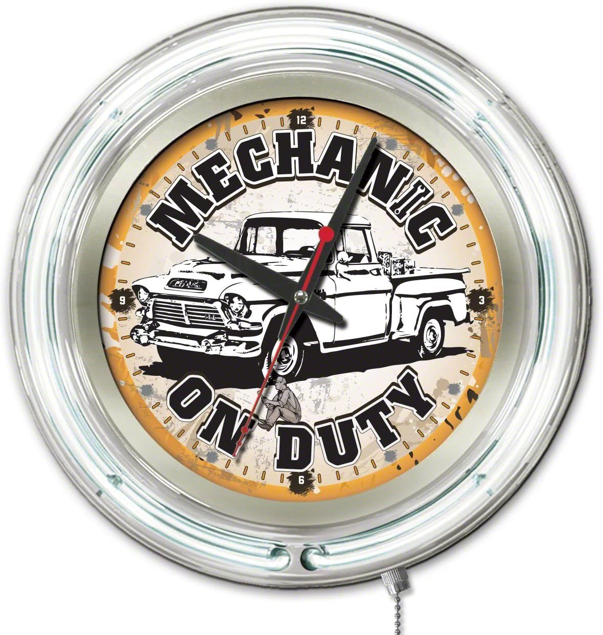 Description. Clock; Mechanic On Duty 15-Inch Double Neon Wall Clock