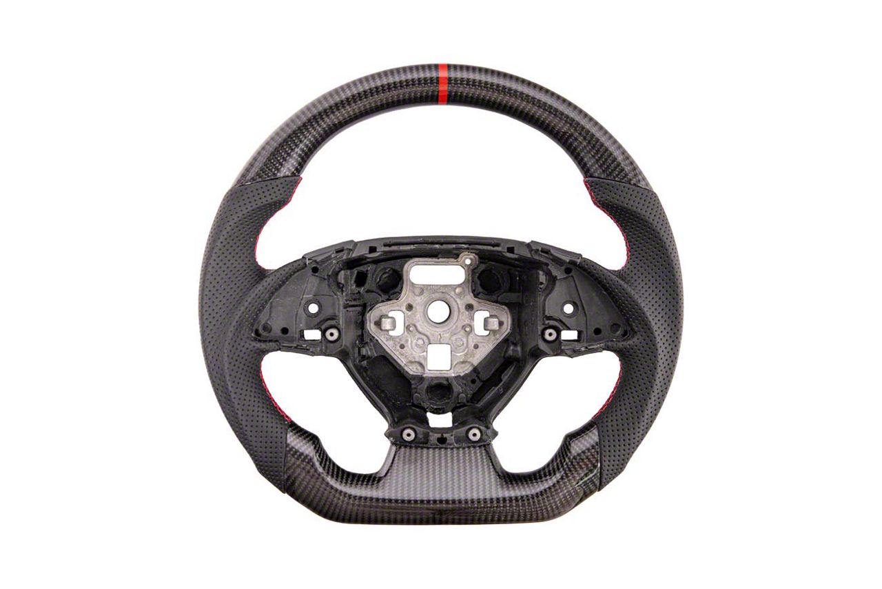 Construction and Appearance. Crafted with perforated leather for improved breathability and grip, this steering wheel also features red stitching for added contrast and detail. A carbon fiber finish gives it a race-ready aesthetic, and while button covers are not included, it is built to accommodate the factory control layout.