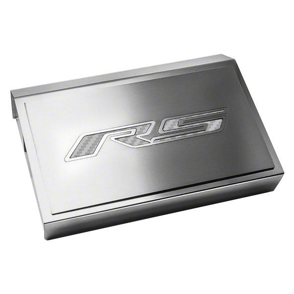 Elevate Your Camaro LT's Engine Bay. Enhance the engine bay of your Camaro LT with RS Package with this elegantly designed Polished Fuse Box Cover, featuring a Brushed RS Top Plate in White. This cover combines functionality with style, offering a dual finish that complements the overall aesthetics of your Camaro.