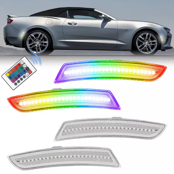 Construction and Appearance. Each side marker is crafted with a clear transparent lens and durable, weather-sealed housing to protect against moisture and road debris. The system includes a convenient remote for dynamic RGB color selection, enabling fully customizable accent lighting with the touch of a button. Quality LED components provide consistent, vivid illumination, while the plug-and-play design ensures a clean, professional fit that complements the Camaro’s aggressive styling.