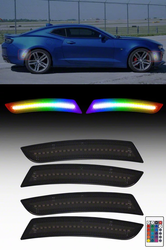 Custom Lighting Enhancement. RGB Dynamic LED Side Markers are designed for 2016-2024 Chevrolet Camaro models and offer a plug-and-play, direct replacement upgrade for both the front and rear lighting profile. Each set includes a smoked black lens, weather-sealed housing, and an easy-to-use remote for color customization, making it perfect for off-road styling and show vehicles. Not DOT approved and intended for off-road use only, these markers bring a bold, dynamic effect to your vehicle’s exterior.