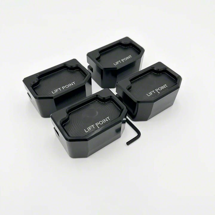 Lifting Essentials. Introducing our exceptional Stealth Lift Pads in Black, a set of 4 lift pads designed to elevate your lifting experience. These lift pads are meticulously crafted with a weight-saving custom design, ensuring efficiency without compromising durability. Their angled structure effectively prevents any bending of the pinch weld, safeguarding your equipment and providing a secure lifting foundation.