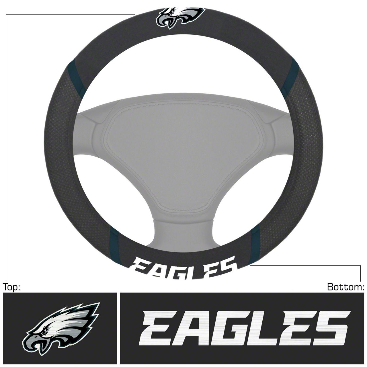 Construction and Appearance. Featuring a matte black finish with a bold, embroidered Eagles logo, this cover combines visual appeal with everyday resilience. The durable edge stitching reinforces the cover’s structure and prevents fraying over time, ensuring a secure and long-lasting fit. Its soft texture improves steering comfort without sacrificing control.