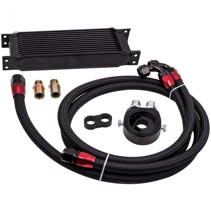 Efficient Engine Oil Cooling System. The Universal Engine Oil Cooler with Oil Filter Adapter and Hose Kit is designed to reduce oil temperatures and enhance engine longevity, especially in high-performance or high-heat environments. Featuring a 13-row aluminum core, this kit provides efficient thermal regulation by circulating oil through an external cooler. It includes both AN-10 fittings and multiple thread options for compatibility with a wide range of applications.