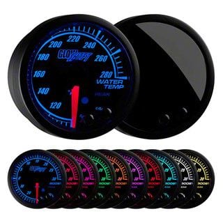 This 2 1/16" (52mm) water temperature gauge outperforms the competition with features that include a peak recall function, programmable high and low warning functions, stepper motor technology, 10 color through dial LED lighting, as well as a self-calibration mode at start up, an illuminated red needle, and a low profile magnified tinted lens. The adjustable high and low warning functions will alert you visually or with an optional audible tone, ensuring your vehicle’s water temp is not running too hot, and the peak recall feature gives you an instant assessment of your vehicle. The included stepper motor technology makes all needle movement remarkably smooth and all gauge readings extremely accurate. GlowShift’s 10 color through dial lighting allows you match your factory gauges or add a distinct look to your vehicle's interior, and with the color recall feature you don’t have to worry about resetting the gauge to your preferred color every time you turn your vehicle on. This water temperature gauge will also dim 30% when connected to your factory headlight switch, making it much easier to read while driving at night.