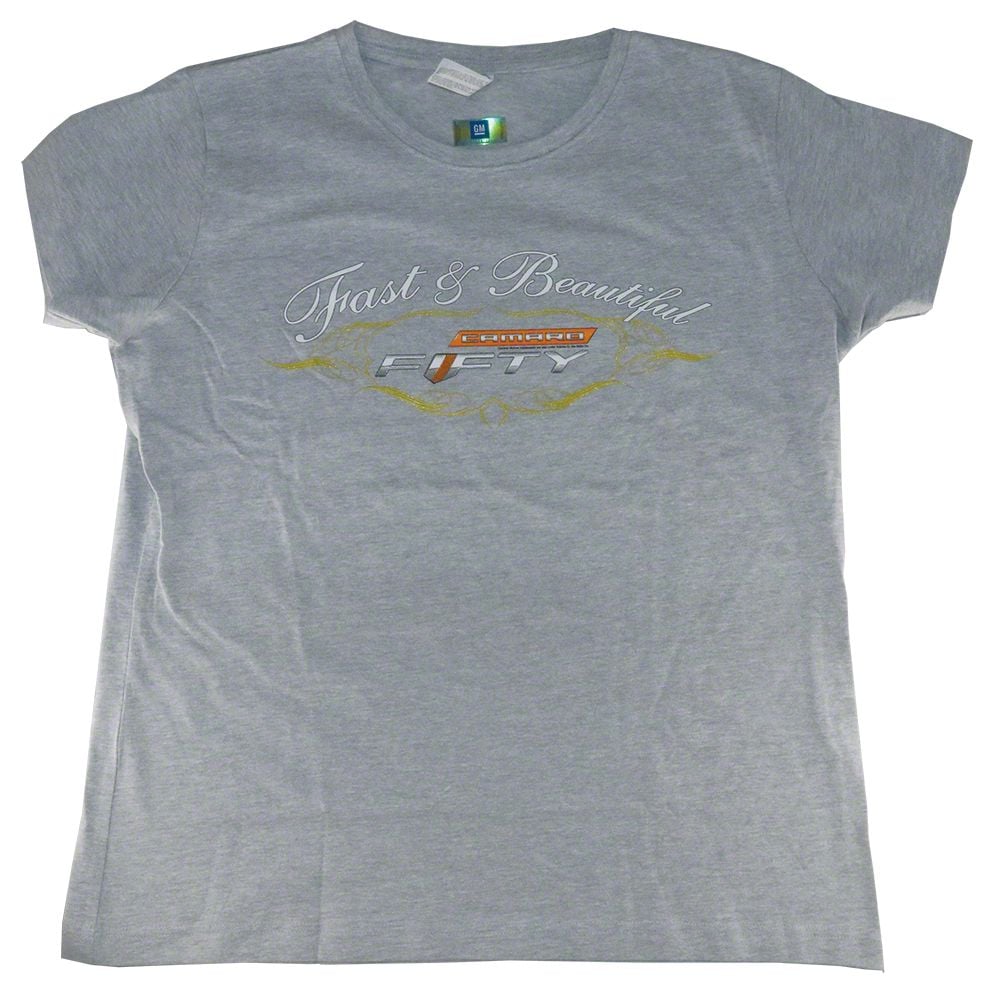 Modern Seat Styling. Made from high-quality fabric, the Woman's Fast and Beautiful Camaro Fifty T-Shirt is comfortable and durable, perfect for casual wear or a day at the car show. Its stylish design features a sleek Camaro print on the front, embodying the speed and beauty that the Camaro represents. This t-shirt comes in a women's cut, providing a flattering fit for all sizes. The shirt is available in various sizes, ensuring a great fit for every Camaro fan.