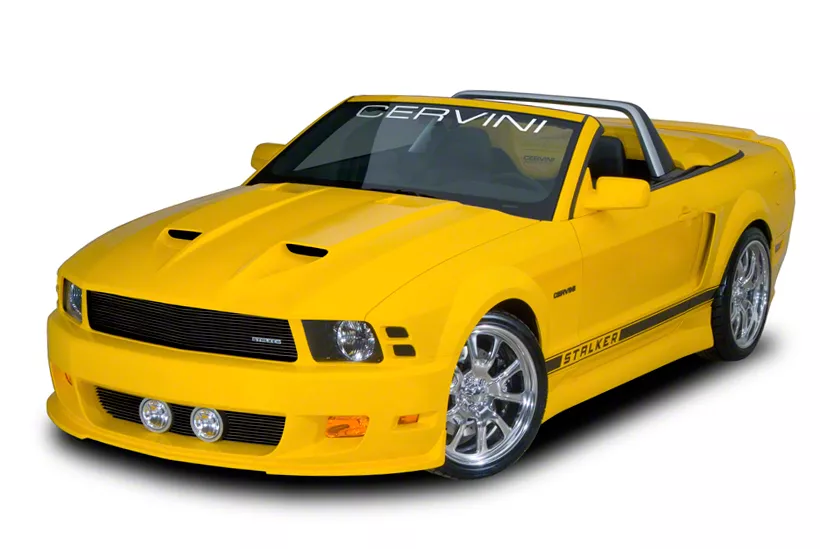 Aggressive Race-Ready Style. The Cervini's Stalker Front Bumper & Hood Kit enhances the Mustang’s sleek silhouette. The hood is 2 inches longer than the stock hood. It also features two air scoops for heat extraction and cold air inflow which can be upgraded with Cervini’s Ram Air kit (sold separately). The front bumper kit also comes with upper and lower billet grilles and fog lights.