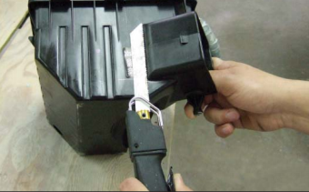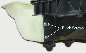Step 6: After the ram air box conversion component has been painted black, install it to the factory air box. Use two small black Phillips screws in the pre drilled holes in the front of the air box. Drill two 1/8” holes in the back of the air box and install two more small black Phillips screws as shown in fi g E.
