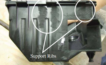 Step 3: Use a grinder to level out the fi rst three support ribs on the right side of the air box as shown in fi g B.
