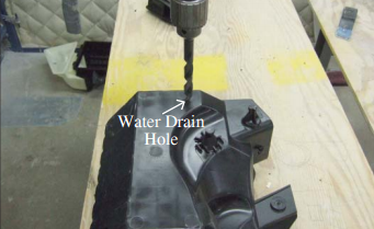 Step 4: There is a water drain hole located on the bottom of the air box. The drain hole must be enlarged to accomodate excessive water from the hood openings when it rains. Use a ½” drill bit to enlarge the hole as shown in fi g C.