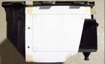 Step 5: Use the supplied template to cut out a bigger opening for the ram air conversion component. Align the template with the second rib from the left of the air box and the bottom of the top lip as shown in fi g D. To make it easier to cut out the new opening in the air box use a 3/8” drill bit to drill out the corners of the air box opening as indicated on the template. Use a saw to cut along the dotted line of the template. Drill the two screw holes in the indicated locations with an 1/8” drill bit.
