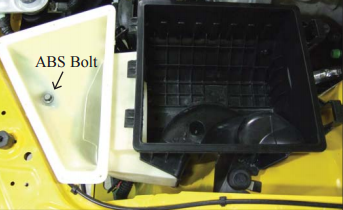 Step 7: Remove the bolt that holds the ABS pump bracket to the radiator support. Set the air box in place and reinstall the ABS bracket bolt and factory air box mounting hardware as shown in Fig F. The six cylinder 4.0 mustang does not have the ABS pump on the radiator support. For these models, use the supplied nut, bolt, and washers.