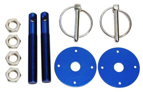 Secure and Style Your Vehicle's Hood. Enhance the security and appearance of your vehicle with the Aluminum Hood Pin Kit. This universal kit is designed to fit a variety of hoods, providing extra safety and a sporty look with its striking blue finish. Perfect for performance cars or any vehicle where additional hood security is desired, this kit is a practical and stylish upgrade.