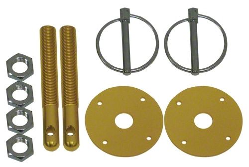 Racing Style. This meticulously crafted Aluminum Hood Pin Kit with a captivating Gold finish seamlessly blends high-performance aesthetics with enhanced vehicle security. Designed to elevate the visual appeal of your vehicle, this kit introduces a touch of racing flair while providing a crucial layer of protection.