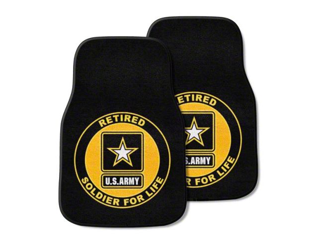 Stylish and Functional Floor Mats. The Carpet Front Floor Mats with U.S. Army Retired Logo make a bold statement in your vehicle while providing essential interior protection. These mats are designed for easy cleaning and maintenance, whether you prefer a quick vacuuming or a more thorough machine wash.
