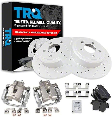 Construction and Appearance. Featuring high-performance ceramic brake pads, this kit reduces brake dust and noise while maximizing friction for improved stopping distances. The cross-drilled and slotted rotors enhance cooling and reduce brake fade under heavy braking. Additionally, the powder-coated calipers provide a sleek appearance and long-lasting resistance against corrosion.