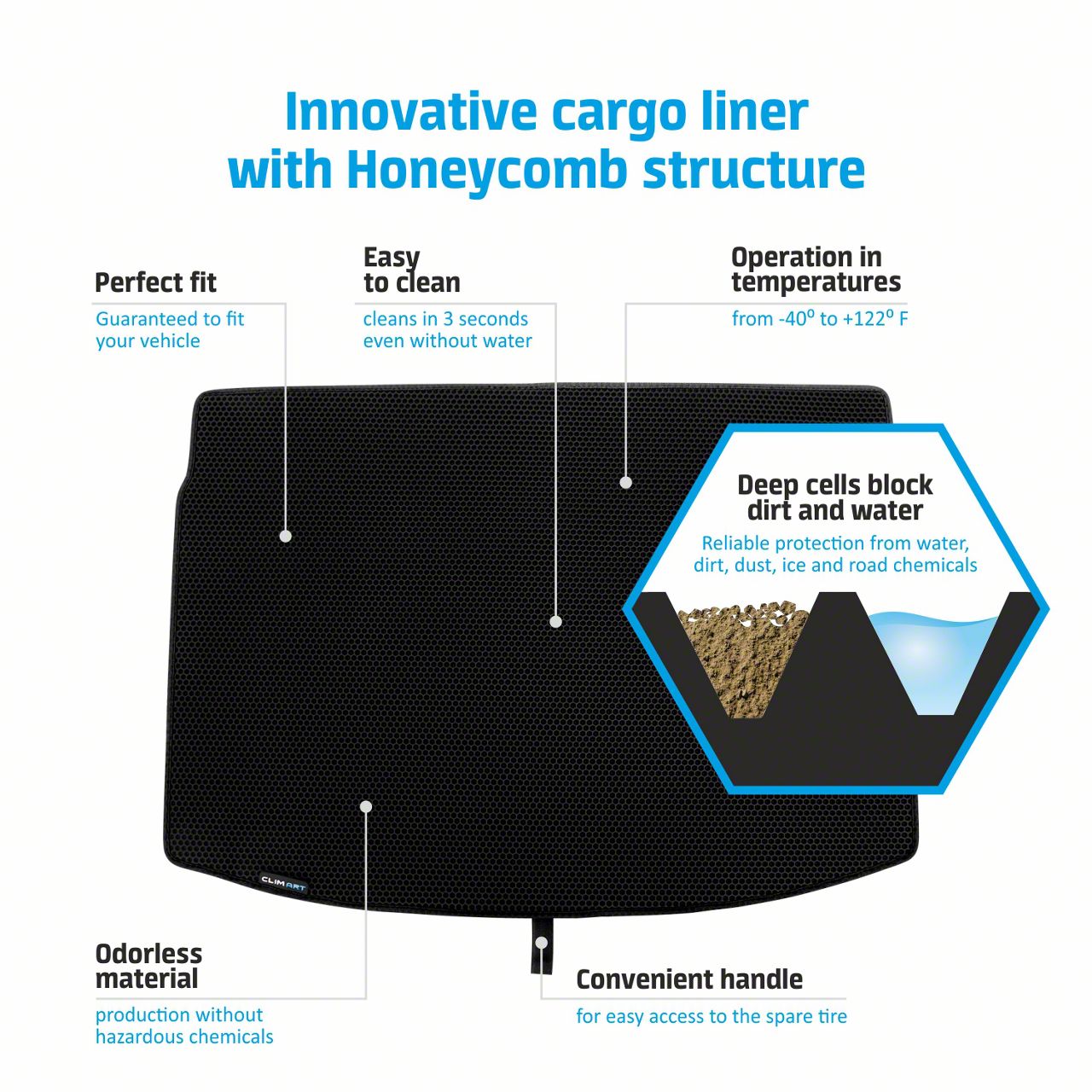 Rugged and Durable. The composite polymer used for the construction of this liner was chosen for its durability and strength. Hexagonal cells pepper the liner surface and effectively trap any dirt or water that gets into the trunk, keeping them away from your luggage. The built-in lift handles and material that's lighter than other mats make lifting this out for cleaning easier.