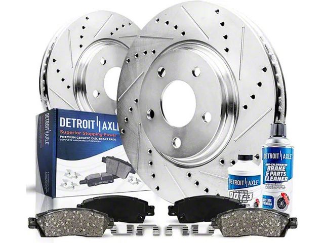 Drilled and Slotted Brake Rotor, Pad, Brake Fluid and Cleaner Kit; Rear (09-20 GT, R/T, Rallye Redline & SXT w/ Dual Piston Front Calipers & Vented Rear Rotors; 2011 SE w/ Dual Piston Front Calipers & Vented Rear Rotors)Find parts that fit my vehicle