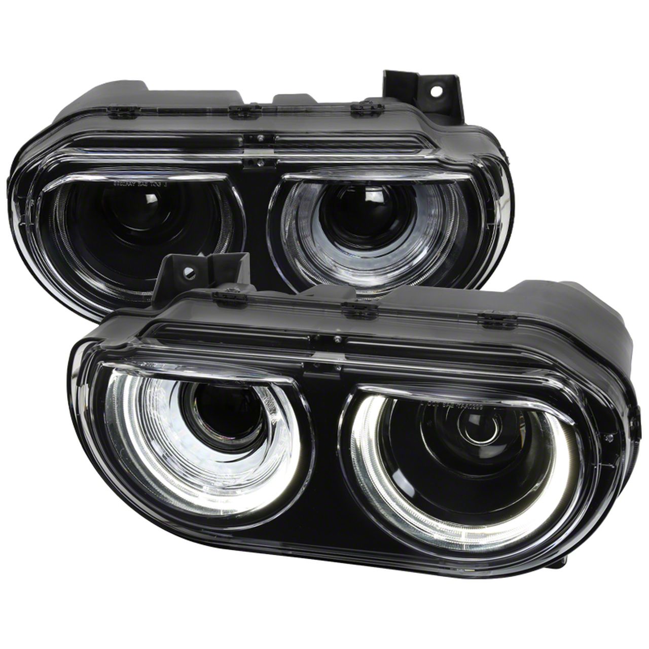 Futuristic Looks. Aside from providing essential beams at night and additional visibility as daytime running lamps, these Dual LED Halo Projector Headlights with Sequential Turn Signals with Black Housing and Clear Lens also bring a unique look to your Challenger's front end. Combined with the amber turn lights, you get both a modern look and exceptional performance from your headlights.