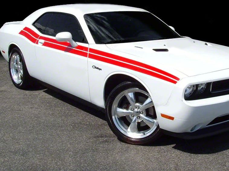 Adds a Vintage Appeal. Personalize your Dodge Challenger with vintage-looking Factory R/T Style Dual Side Stripes in Gloss Black. These stripes call to mind the race cars of the past with their sporty styling. The kit comes with 2 sets of stripes that are meant to span the side of your Challenger. Each side comes with 7 pieces hugging the side panels and door perfectly with an attractive slight wave under the rear side window.