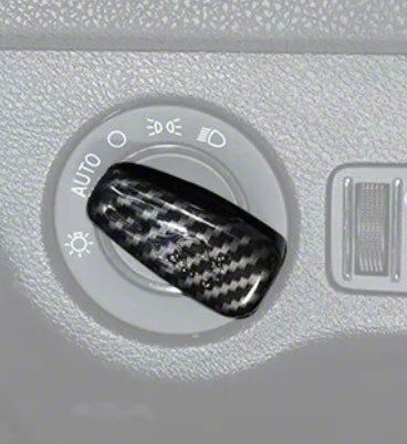 Cover up the factory headlight knob with this carbon print molded cover. Double-sided tape is included to keep it snug in place.