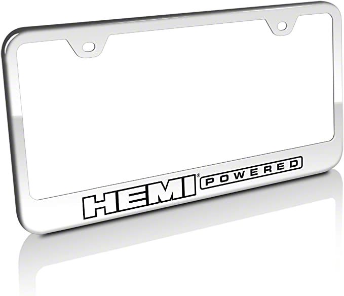 Robust Steel Construction. This license plate frame is constructed from a premium stainless steel sheet, offering exceptional durability and corrosion resistance. Moreover, this license frame is precision-cut and formed to exact specifications for an OE-grade fit when installed. The HEMI Powered logo for its part is laser-etched in black, ensuring a long-lasting fade-resistant look. Lastly, this component receives a chrome finish, giving it a classy look.