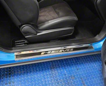 Stylish Entry with Illuminated Design. The Illuminated Carbon Fiber Door Sills with HEMI Lettering add a touch of elegance and style to your Challenger. Featuring illuminated HEMI lettering, these door sills provide a sleek and sophisticated glow, making every entry and exit a statement.