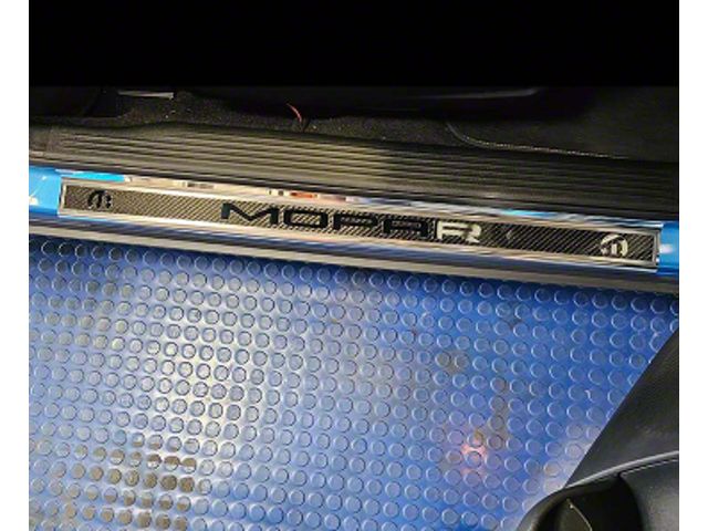Visual Enhancement. The Illuminated Carbon Fiber Door Sills with Mopar Lettering elevate the look of any Dodge Challenger with their sleek design and glowing red LED accents. These door sills make a bold statement while ensuring longevity and resilience against tarnishing, fading, or rusting.