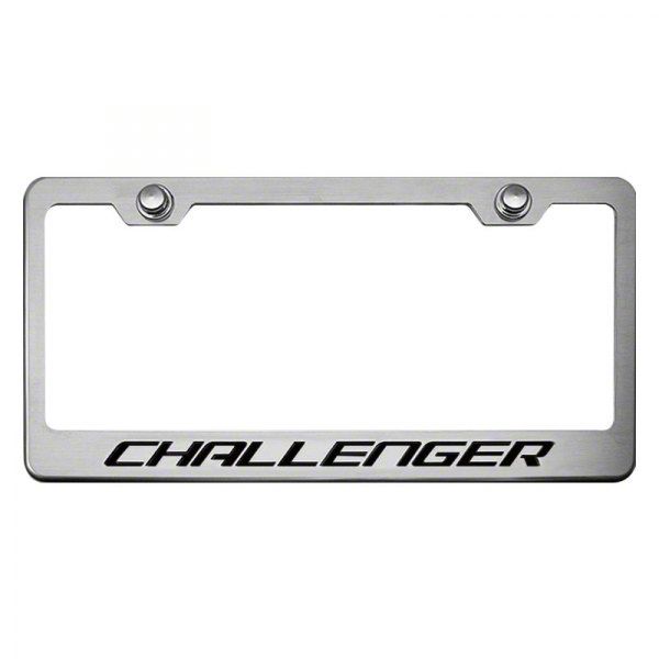 Challenger Design. Made for a universal fit, this License Plate Frame comes in a raw metal finish. Handcrafted from 304 stainless steel, this License Plate Frame has a cool matte black finish with a stylized Challenger lettering design that gives a nice look to your ride’s license plate.