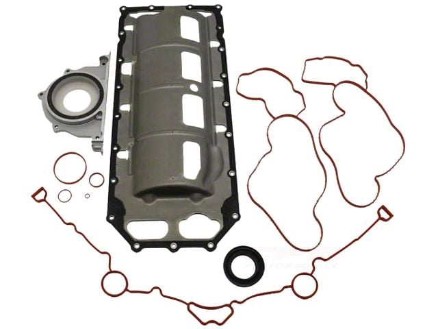 Engine Preservation. The Lower Gasket Conversion Kit is an essential upgrade for maintaining the integrity of your engine. Designed for 2008 - 2023 5.7L HEMI Challenger models, this complete kit includes an oil pan, rear main seal, water pump, and a timing cover, ensuring your engine is sealed and protected against leaks and other common issues. The matte black and raw metal finish of the components not only provides durability but also enhances the engine's appearance.