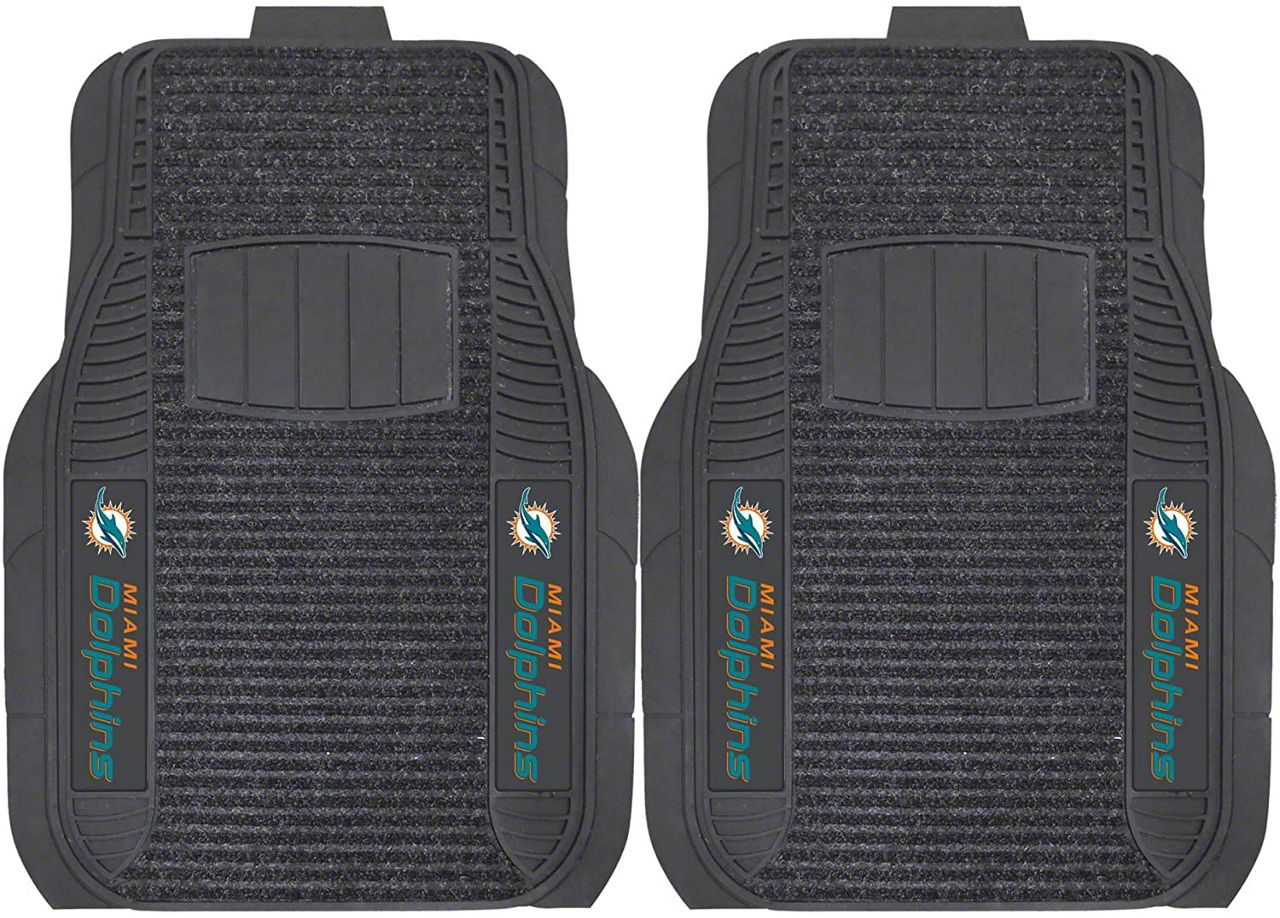 Application. These Molded Front Floor Mats with officially-licensed Miami Dolphins logo feature a universal design so they will fit most makes and models of vehicles. These Mats can be trimmed to fit if necessary. Sold as a set of two Mats.