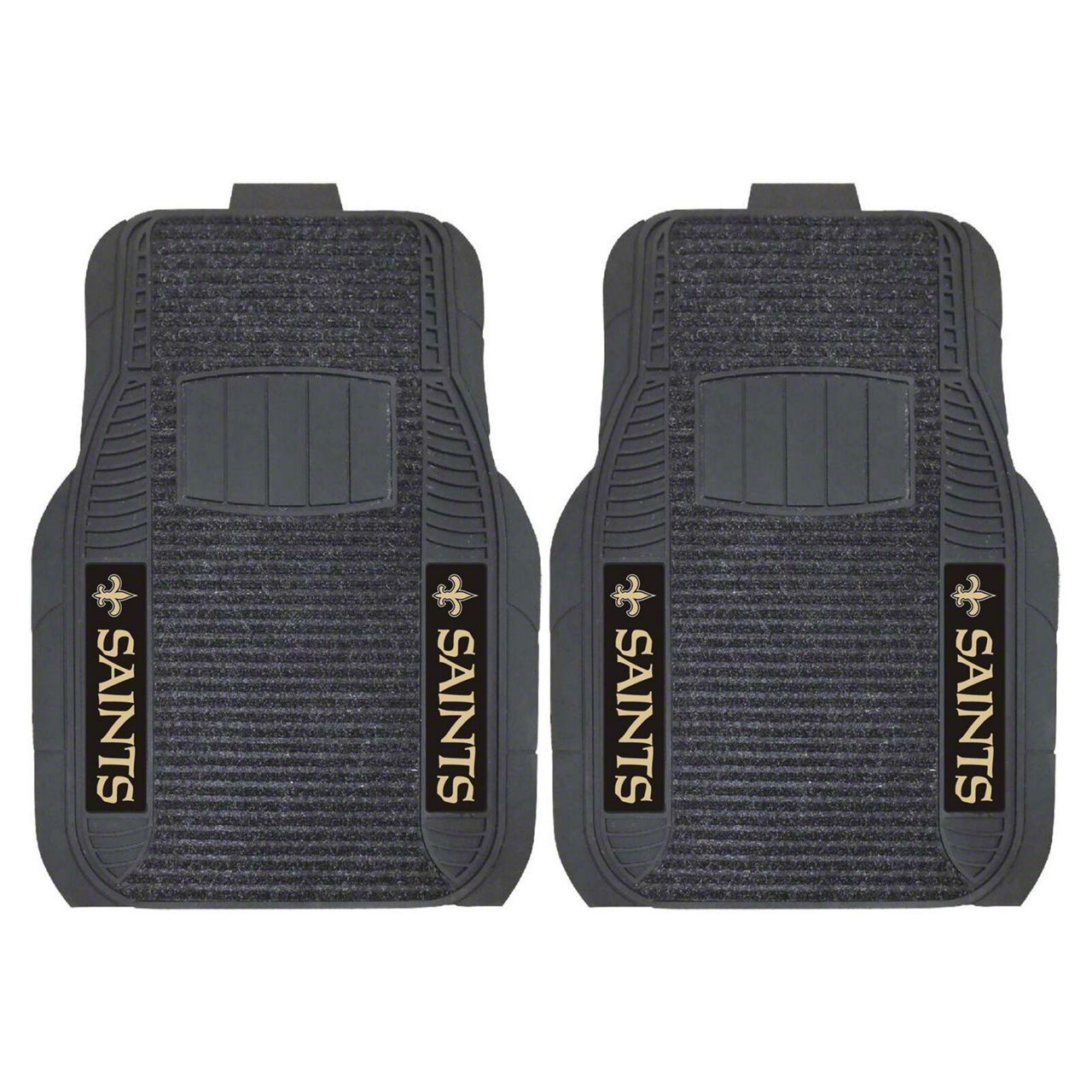 Application. These Molded Front Floor Mats with officially-licensed New Orleans Saints logo feature a universal design so they will fit most makes and models of vehicles. These Mats can be trimmed to fit if necessary. Sold as a set of two Mats.
