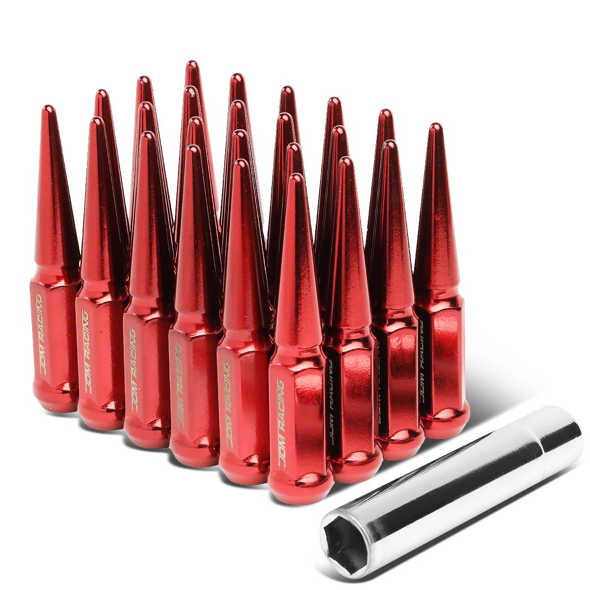 Durable Cold-Forged Steel Construction. Built from single-piece cold-forged carbon steel, these Red Spiked Lug Nuts; M14x1.5; Set of 24 offer exceptional strength and resistance to impact. The forging process enhances the structural integrity of each piece, ensuring they can withstand repeated installations and removals without deforming. This durability makes them ideal for high-performance applications where reliability is critical, such as drag racing or spirited driving.