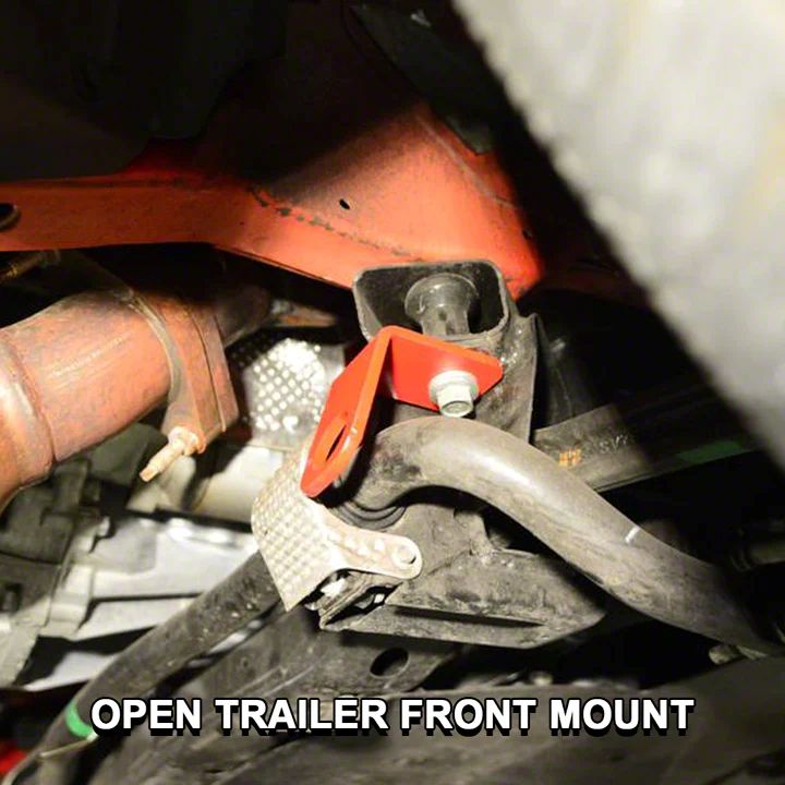 Red Powder-Coated Steel. This set of four red powder-coated strap points offers unparalleled convenience and safety for both front and rear placement. Made of robust 1/4-inch cold-rolled steel, these points ensure stability and durability. Installation is a breeze with a no-drill approach, making it quick and easy to strap your car to the trailer.