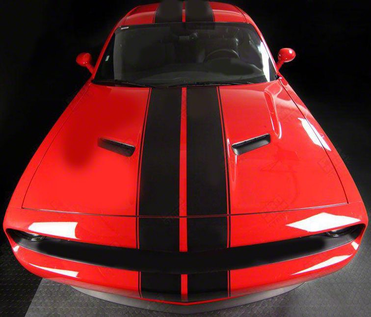 Construction and Appearance. Featuring a matte black finish, this pre-cut pinstriping kit is crafted for a perfect fit on Dodge Challenger models. The double stripes design adds a modern, aggressive look to your vehicle, making it stand out on the road. The pinstriping is durable and made to last, ensuring it holds up well against the elements.