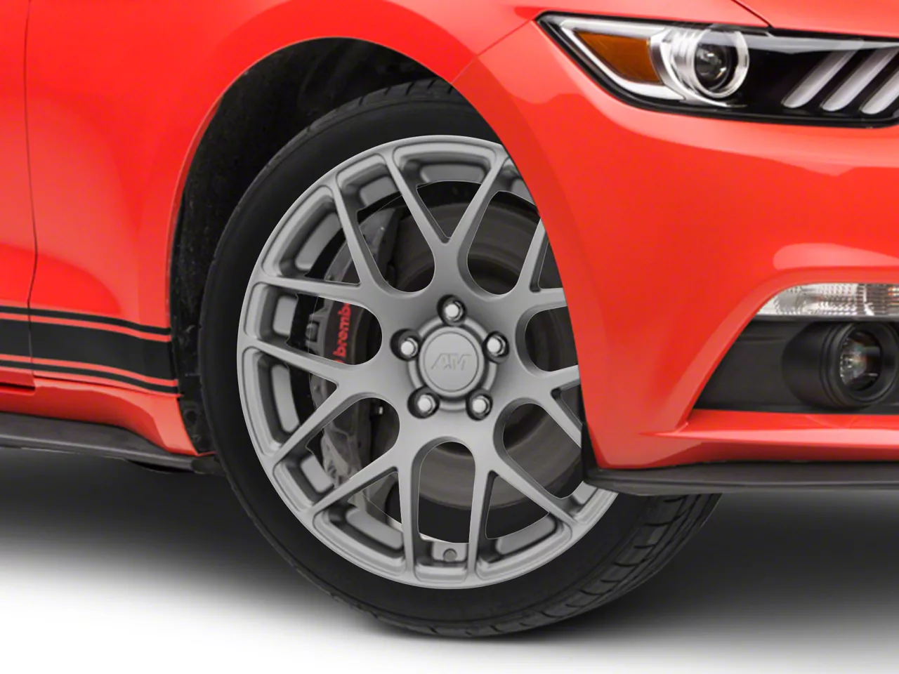 The 18x9 American Muscle Wheels AMR Charcoal Wheel; 18x9 is completed in a dark charcoal hue that is lighter than the standard "Henry Ford" black, this wheel features a durable matte clear-coated finish for a stealthy appearance.