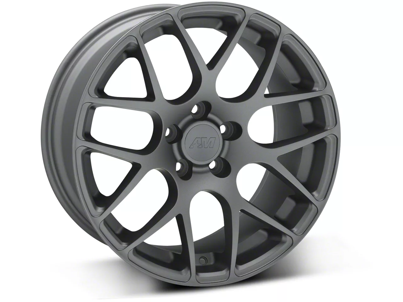 The 18x9 American Muscle Wheels AMR Charcoal Wheel; 18x9 is completed in a dark charcoal hue that is lighter than the standard "Henry Ford" black, this wheel features a durable matte clear-coated finish for a stealthy appearance.