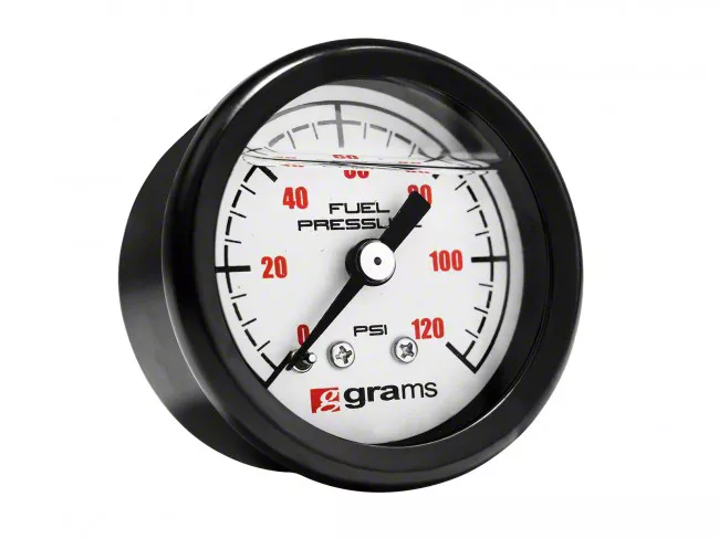 Easy to Read Fuel Pressure Gauge. Enjoy accurate fuel pressure gauge readings with the 0-120 PSI Fuel Pressure Gauge; White. This silicon-filled fuel pressure gauge measures 0-120 PSI (8.27 bar) using an easy-to-read white face against a half-inch face against a sleek matte black stainless steel casing and an OEM grade glass lens.