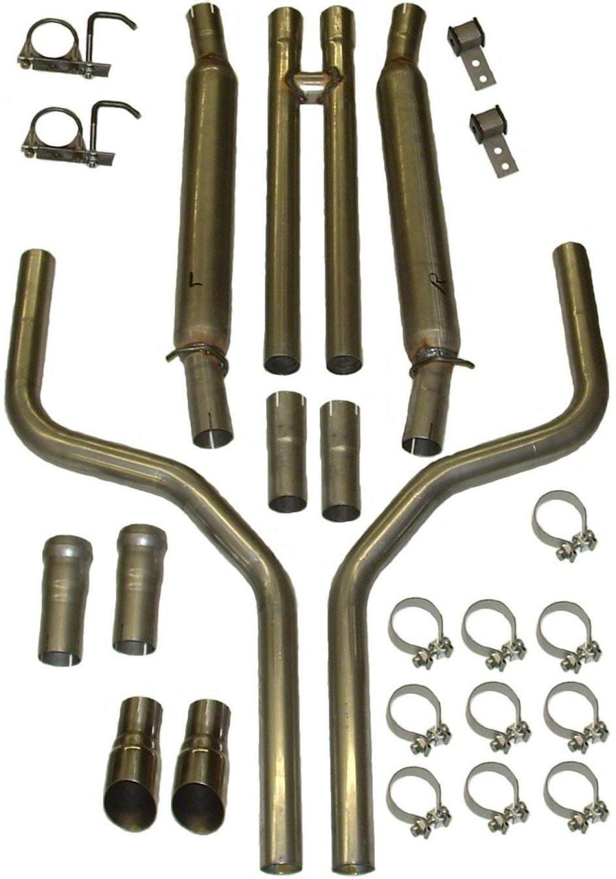 Construction and Appearance. Crafted from 2.25-inch aluminized steel, this exhaust system offers durability and corrosion resistance. The polished stainless steel exhaust tips add a sleek, premium finish to your vehicle's appearance, ensuring it looks as good as it performs.