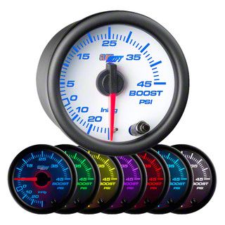 High-Performance Boost Gauge. The 45 PSI Boost/Vacuum Gauge with White 7 Color LED is designed for drivers of turbocharged vehicles who require precise monitoring of boost and vacuum levels. It measures from -30 inHG vacuum to 45 PSI boost, providing vital feedback to optimize engine performance and ensure safe operation under increased pressure conditions.