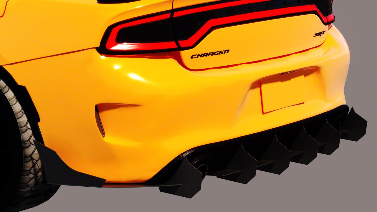 Aggressive Street Look. Transform your Charger's rear end into a statement of power and style with the Aluminum Rear Diffuser with Large Wing; Matte Black. Beyond aesthetics, this rear diffuser is engineered to improve aerodynamics, optimizing airflow and reducing drag for improved performance. The integrated Large Wing not only enhances the visual impact but also contributes to your Charger's stability at higher speeds. Designed with both form and function in mind, the wing adds an extra layer of sportiness while enhancing your vehicle's overall driving dynamics.