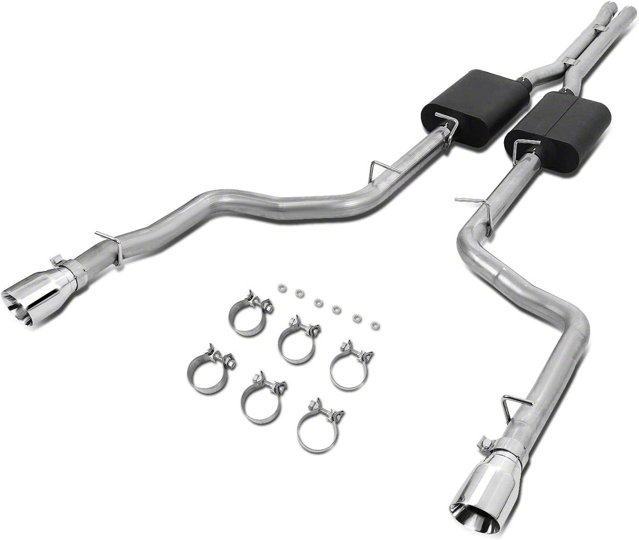 Durable Cat-Back Construction. This cat-back exhaust utilizes 2.50-inch diameter aluminized steel pipes for maximum durability. These pipes are manufactured using computerized mandrel bends to ensure a smooth interior surface. Meanwhile, the 4-inch diameter tips are double-walled, featuring a diagonal cut for added style. These pairs are made from stainless steel material and polished to perfection.