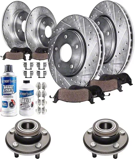 Complete Brake Upgrade Kit. This Drilled and Slotted Brake Rotor, Pad, Hub Assembly, Brake Fluid, and Cleaner Kit is a high-quality replacement designed to restore the braking performance of your vehicle. It includes all the essential components needed for a complete front and rear brake service, ensuring reliable stopping power and enhanced durability. Made to meet or exceed OEM specifications, this kit offers a direct-fit solution for optimal safety and performance.