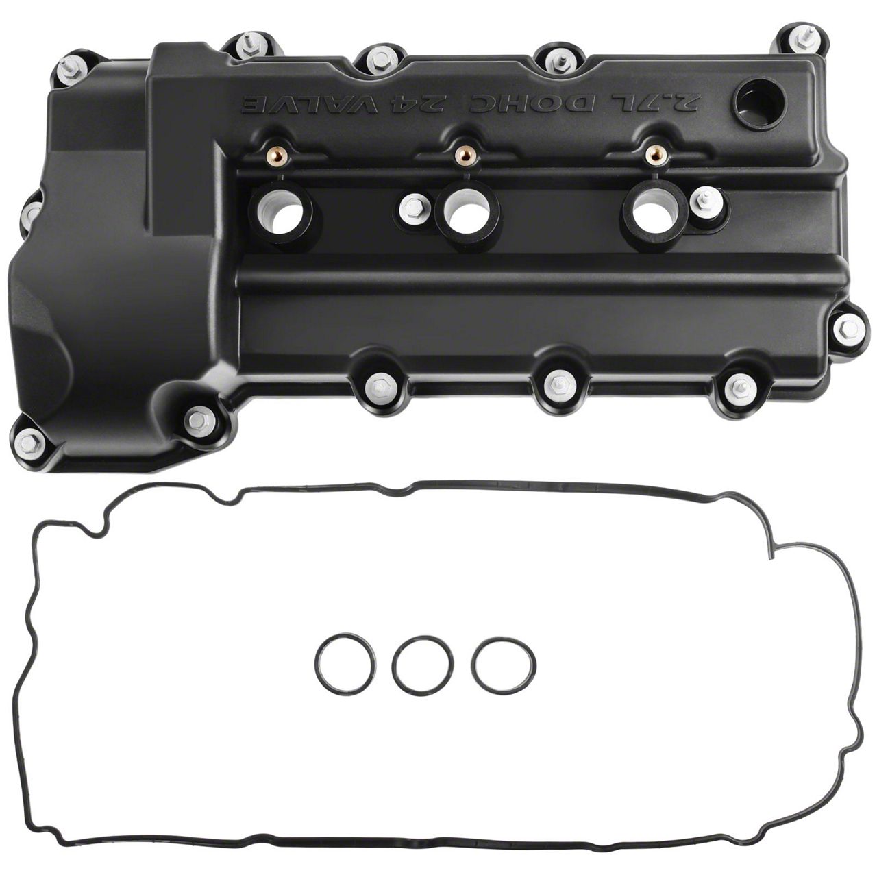 Construction and Appearance. This valve cover is constructed from durable plastic engineered to withstand heat and pressure within the engine bay. It features a black finish that provides a sleek appearance and corrosion resistance over time.