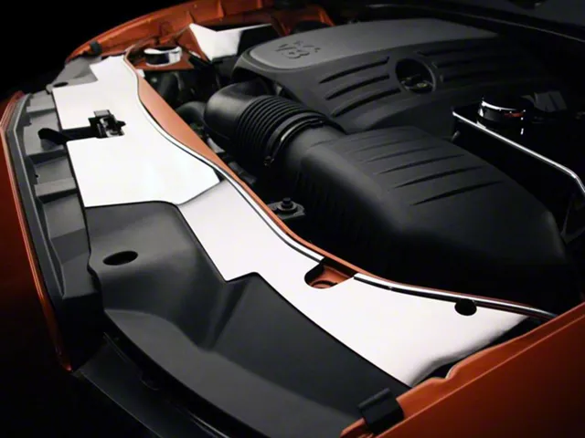 Bright Engine Coverage. Sport a cool premium look for your Charger's hood with this Front Header Plate; Polished. Designed to fit right over the radiator support section of your front end, it is precision cut from stainless steel to match the curves and size of your vehicle, with no extra modifications needed. It is treated to withstand impact and heat from your system as well as adding a brighter appearance to your under hood set up.