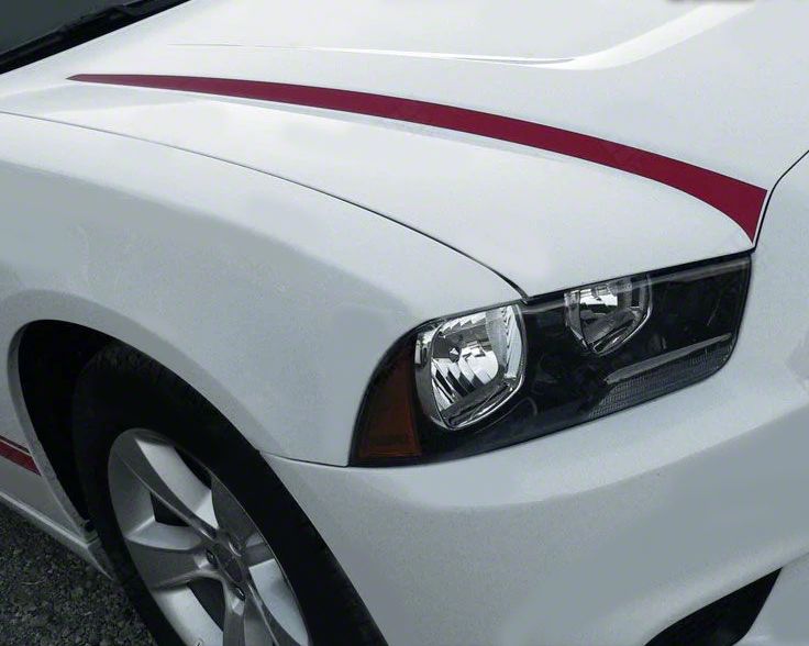 Eye-Catching Hood Accents. The Hood Accent Side Spear Stripes offer a bold and stylish enhancement to your 2011-2014 Charger models. Featuring a glossy red finish, these pre-cut stripes add a dynamic and aggressive look to the hood of your vehicle.