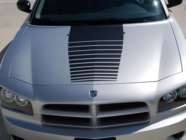 Construction and Appearance. Manufactured from top-grade vinyl material, this Hood Stripe features a durable Matte Black finish. What's more? These Hood Stripes come pre-cut for precise fitment and include an automotive-grade adhesive for secure application on your Dodge Charger.